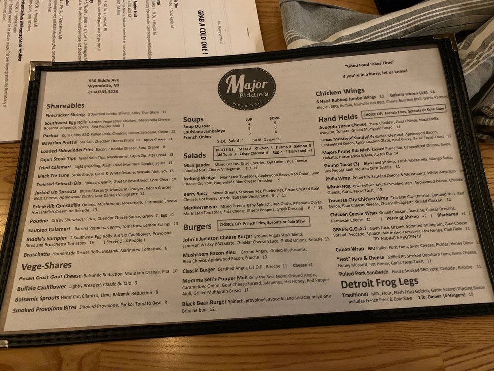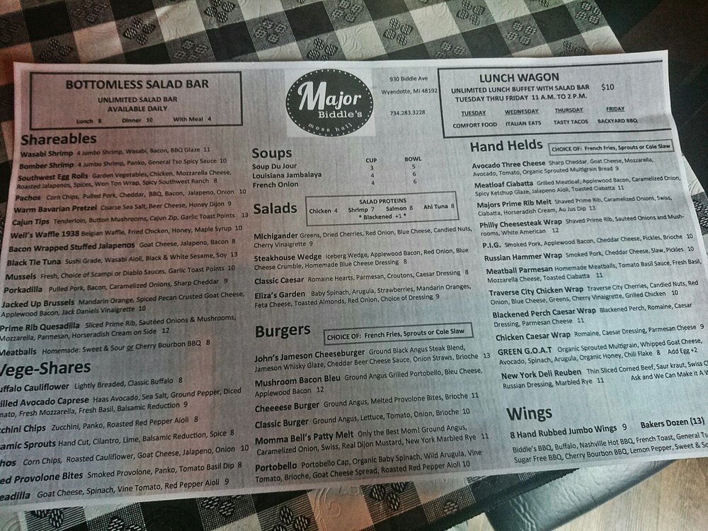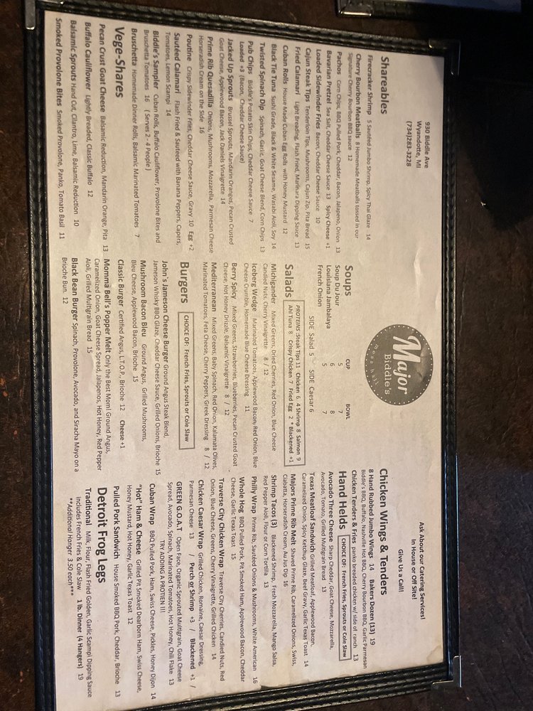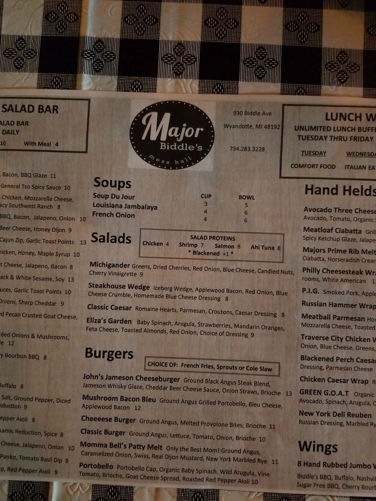 Major Biddles, located at 930 Biddle Ave in Wyandotte, MI, is a beer bar with a focus on American cuisine and seafood. This restaurant offers a variety of vegetarian options and provides a casual dining experience with moderate noise levels. Perfect for groups and kids, Major Biddles also offers outdoor seating and has both street and private lot parking available. The menu features a full bar and waitstaff service, allowing guests to enjoy a wide selection of dishes while watching TV. The reusable tableware provided adds to the eco-friendly approach of the restaurant. Overall, Major Biddles is a great spot for those looking for a relaxed atmosphere and delicious food options in the Wyandotte area.